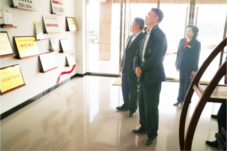 在荣誉墙前面,金鼎安全董事长蔡长辉向戴处长一行介绍了金鼎安全近年来取得荣誉,这些荣誉是政府和社会对金鼎安全直观的肯定。金鼎安全在瓦斯开采和利用上不断创新,致力于打造矿山安全领域独角兽。